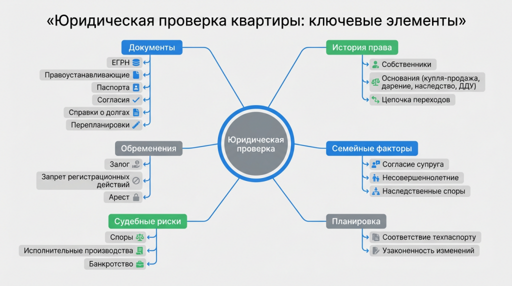 Проверка чистоты начинается с ЕГРН: правообладатели, вид права, обременения, особенности регистрации. Далее — основания права, цепочка сделок, семейные и наследственные факторы, судебные и исполнительные риски.