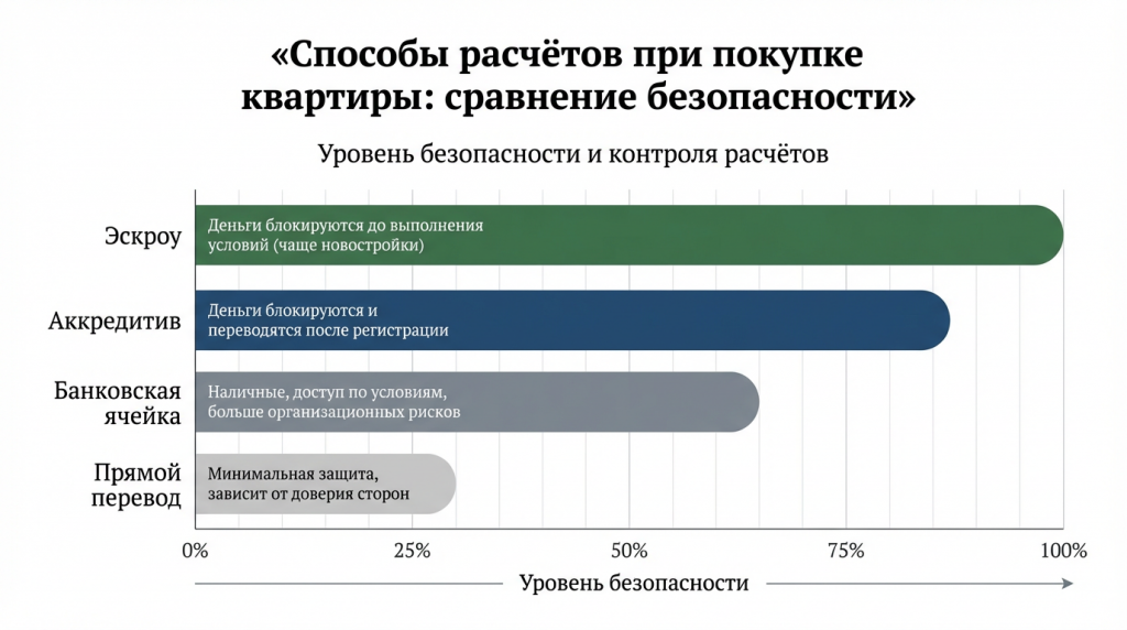 Наиболее безопасны безналичные расчёты с контролируемой разблокировкой денег: аккредитив или ячейка. Выбор метода зависит от ипотеки, сроков регистрации, доверия к банку и стоимости услуги.