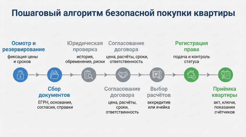 Безопасная сделка — это дисциплина шагов, понятные сроки, прозрачные деньги и сильный договор. Если досье квартиры чистое, расчёты заблокированы до регистрации, а акт детальный, шанс проблем минимален.